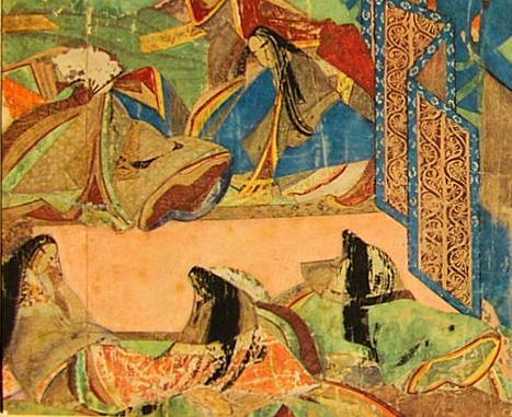 源氏物語絵巻が傷んで髪が剥げている部分の下に、唐衣の襟が見えます。
