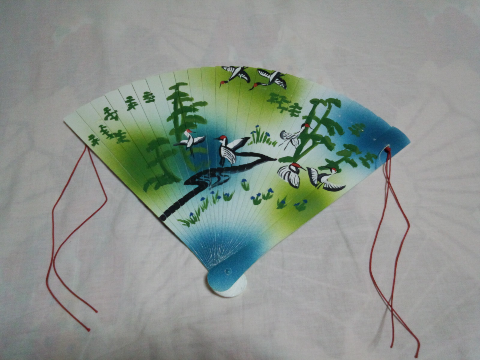 ずっと前に買った男性用の無地の扇に絵を描いて紐をつけてみました。